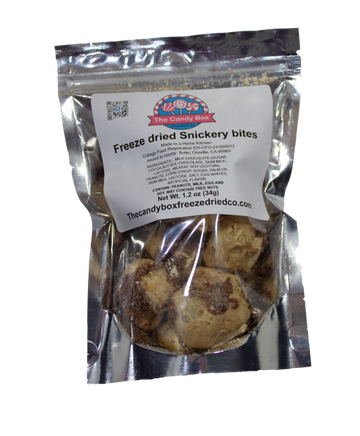 Made in a Home Kitchen in Oroville ,CA. This freeze dried candy is made from the candy bar Snickers transformed into a crunchy and light candy snack by the Freeze Drying Process.