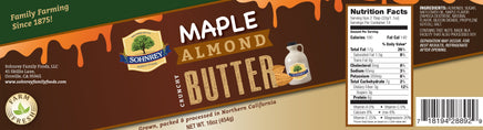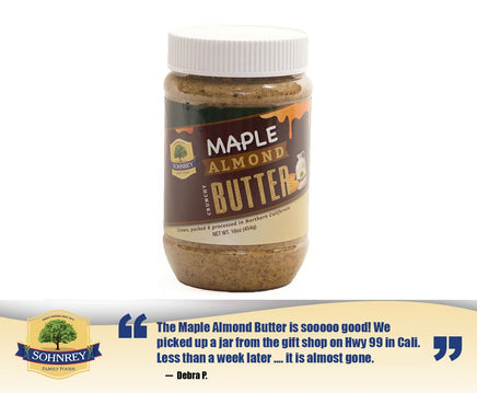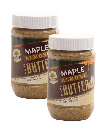 - Maple Almond Butter (16oz) - As good as it sounds. This jar of crunchy Almond Butter is packed with serious mouthwatering flavor! Small batches of perfectly roasted almonds are ground up and blended with maple flavor, sugar, salt and a little extra vegetable oil to help make it spreadable. This lightly sweetened nut butter is packed with protein and is gluten free. It will have you saying, "Mmmaple!"