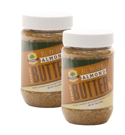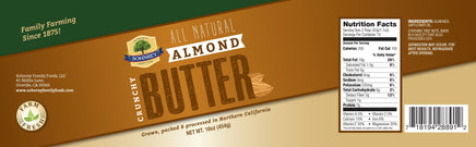 - All Natural Almond Butter (16oz) - A crunchy almond butter made with oil roasted almonds. Our All Natural crunchy Almond Butter has a rich roasted almond flavor and contains only a maximum of 2% expeller pressed safflower oil from our roasting process. All our nut butters are produced in small batches. Thick and nutritious. 7g of protein per serving and is also a good source of potassium, vitamin E, and magnesium. There is no added salt or sugar.