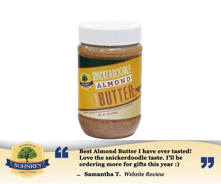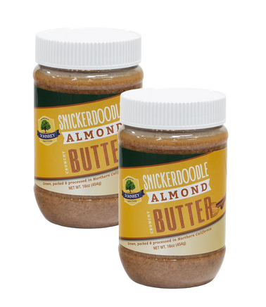 - Snickerdoodle Almond Butter (16oz) - ....need we say more?! This is the almond butter you never knew you needed! You gotta try it, you won't be disappointed! This is a crunchy Almond Butter made in small batches with sugar, cinnamon, salt and a little extra vegetable oil to help make it spreadable. When we developed this product we tried different types of cinnamon and what we found was using premium Korintje cinnamon (also known as Makara cinnamon) was the only way to go. The resulting flavor is fantastic and reminds us of grandmas Snickerdoodle cookies.