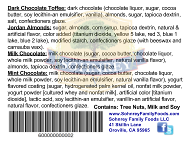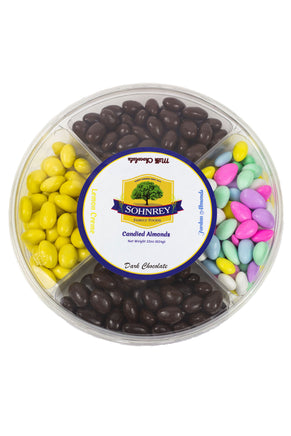 Our Candy Almond Round tray features a total of 22 oz of candy split between four different delicious candy coated almond treats: Milk Chocolate Almonds, Jordan Almonds, Dark Chocolate Almonds, and Lemon Creme Almonds.
