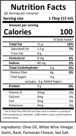 Olive Oil, White Wine Vinegar, Garlic, Basil, Parmesan Cheese, Sea Salt