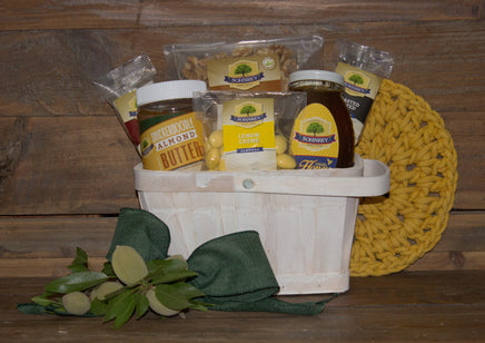 This basket is the perfect blend of sweet and salty, with one pound of Sohnrey Family Foods Honey, Walnuts, a jar of our famous Snickerdoodle Almond Butter, two bags of seasoned almonds, and candy almonds