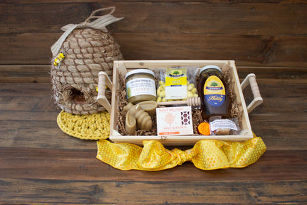 Straight from the hive! This fun bee themed basket is filled with California creamy honey, a handmade beeswax candle, a wooden honey dipper, Sohnrey Family Foods Lemon Creme Almonds, 1lb of honey, Honey Hill Farm bar soap, The Grateful Tea sugar cube, and Honey Acres Chocolate Honey pattie.