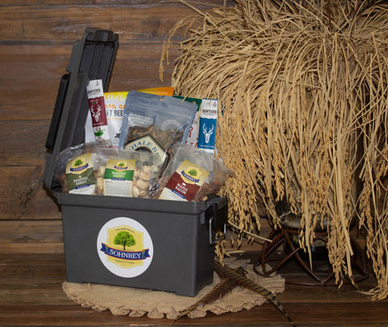 Give a gift your hunter will enjoy on their next excursion! This ammo box is filled with a variety of Sohnrey Family Foods seasoned almonds and pistachios, along with a bag of Jerky Gourmet jerky, Hunter’s Reserve meat sticks, Inhale BBQ Seeds, and Everton Pretzels.