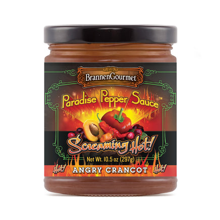 Angry CranCot Paradise Pepper Sauce - For fans who love heat! Take your favorite recipes to a new level of flavor with Brannen Gourmet's zesty combination of chunky California red bell peppers, fresh cranberry and local apricots infused with Chocolate Habaneros delivering a taste sensation. Perfect over any soft cheese, tacos, meatloaf, or even glaze it over chicken, pork or other meats!