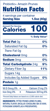 Ingredients: Pitted Prunes (Dried Plums), Natural Flavor, Bacillus Coaguluns GBI-30 8088, Potassium Sorbate (As a Preservative).