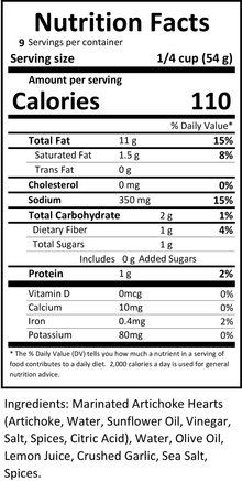 - Ingredientes: Alcachofas Marinadas (corazones de alcachofa, agua, sal, ácido cítrico, vinagre, especias), Agua, Aceite de Oliva, Zumo de Limón, Ajo, Sal Marina, Especias