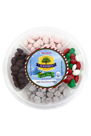 Nuestra bandeja redonda Christmas Candy Almond tiene capacidad para 22 oz de dulces y presenta una variedad de delicias festivas y sabrosas de almendras recubiertas de chocolate y dulces: