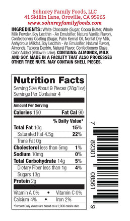 Ingredients: White Chocolate, Confectioners Coating, Almonds, Tapioca Dextrin, Natural Flavor, Confectioners Glaze, Color Added (Yellow 5 Lake)