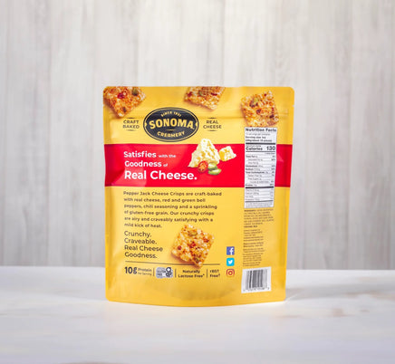 Experience the authentic flavor of Sonoma with Sonoma Creamery's real Pepper Jack cheese crisps. Made with 10g of protein and baked to perfection, these gluten-free, craft snacks feature a mild kick of heat from red and green bell peppers and chili seasoning. Family farm-crafted in Sonoma, California since 1931. rBST Free naturally lactose free enjoy the taste of Sonoma Creamery's real Pepper Jack cheese crisps. These gluten-free, craft snacks are made with 10g of protein and feature a mild kick of heat from red and green bell peppers and chili seasoning. Perfect for the whole family to savor. And it's family farm-crafted in Sonoma, California since 1931, so you know it's made with love and care.
